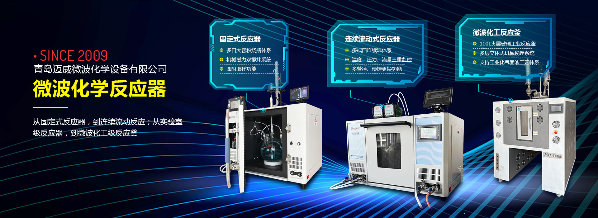 青島邁威微波化學設備有限公司創(chuàng)立于2009年9月,公司坐落于青島國家高新技術產業(yè)開發(fā)區(qū),是一家專業(yè)從事微波技術在化學和化工領域應用的科技型企業(yè)。邁威堅持“微波化學”作為產品設計和工藝研發(fā)的學科基礎,致力于滿足用戶對化學實踐中“效率、速率、收率”的需求,擁有“開放式、密閉式、連續(xù)流動、微量以及高溫處置”五大類微波化學反應體系,近百個產品種類,滿足了用戶對于化學、化工、新材料、生物制藥以及能源和環(huán)保領域的產品需求。